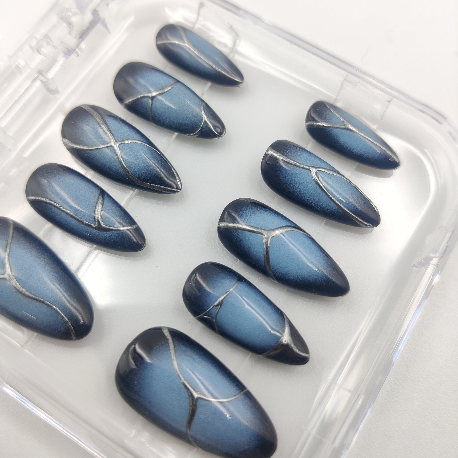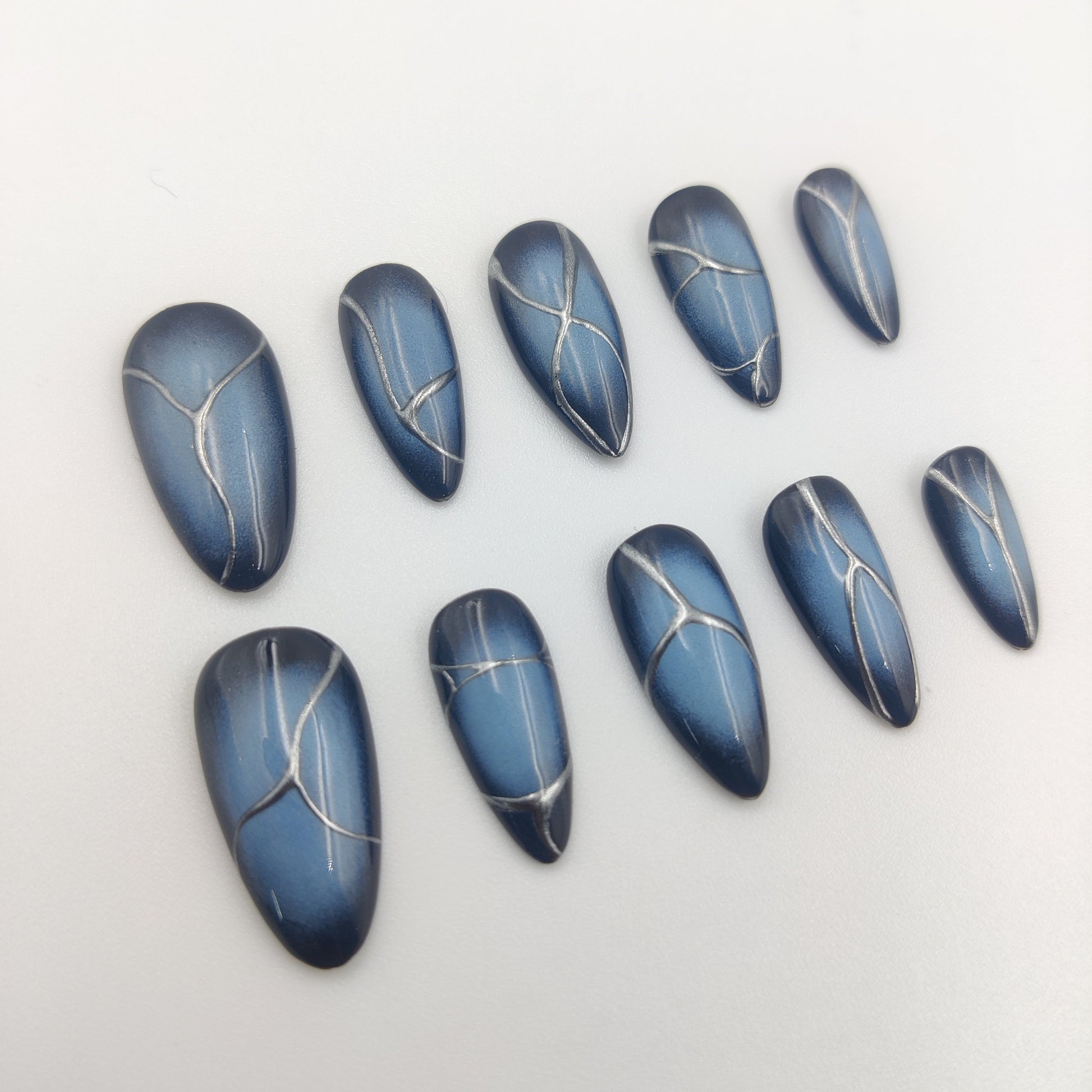 A deep midnight blue laced with metallic silver veins, this set channels strength, mystery, and resilience. Bold yet refined, Midnight Veins is for those who thrive in the dark and shine under pressure — unapologetically striking, endlessly unforgettable